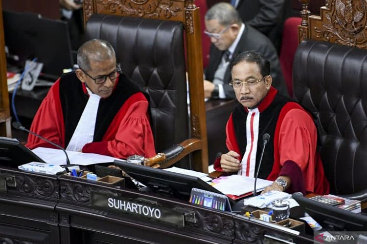 TIMES Kalbar/Ketua Mahkamah Konstitusi (MK) Suhartoyo (kanan) bersama Wakil Ketua MK Saldi Isra memimpin sidang pengucapan putusan perkara dilanjutkan atau tidak (dismissal) sengketa Pilkada 2024 di Gedung Mahkamah Konstitusi, Jakarta, Rabu (5/2/2025). (ANTARA)